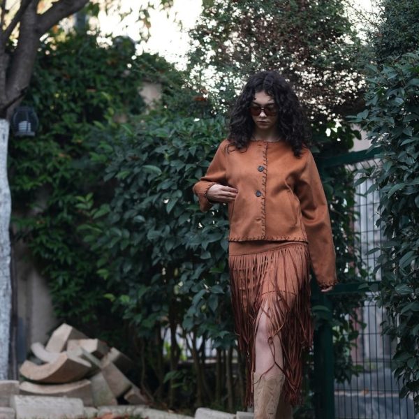 | Açıklama | Vintage tarzına karakter katmak isteyen kadınlara sunulan Uzun Saçaklı Süet Etek, saçak detayları sayesinde hareketli bir kombin vadeder.